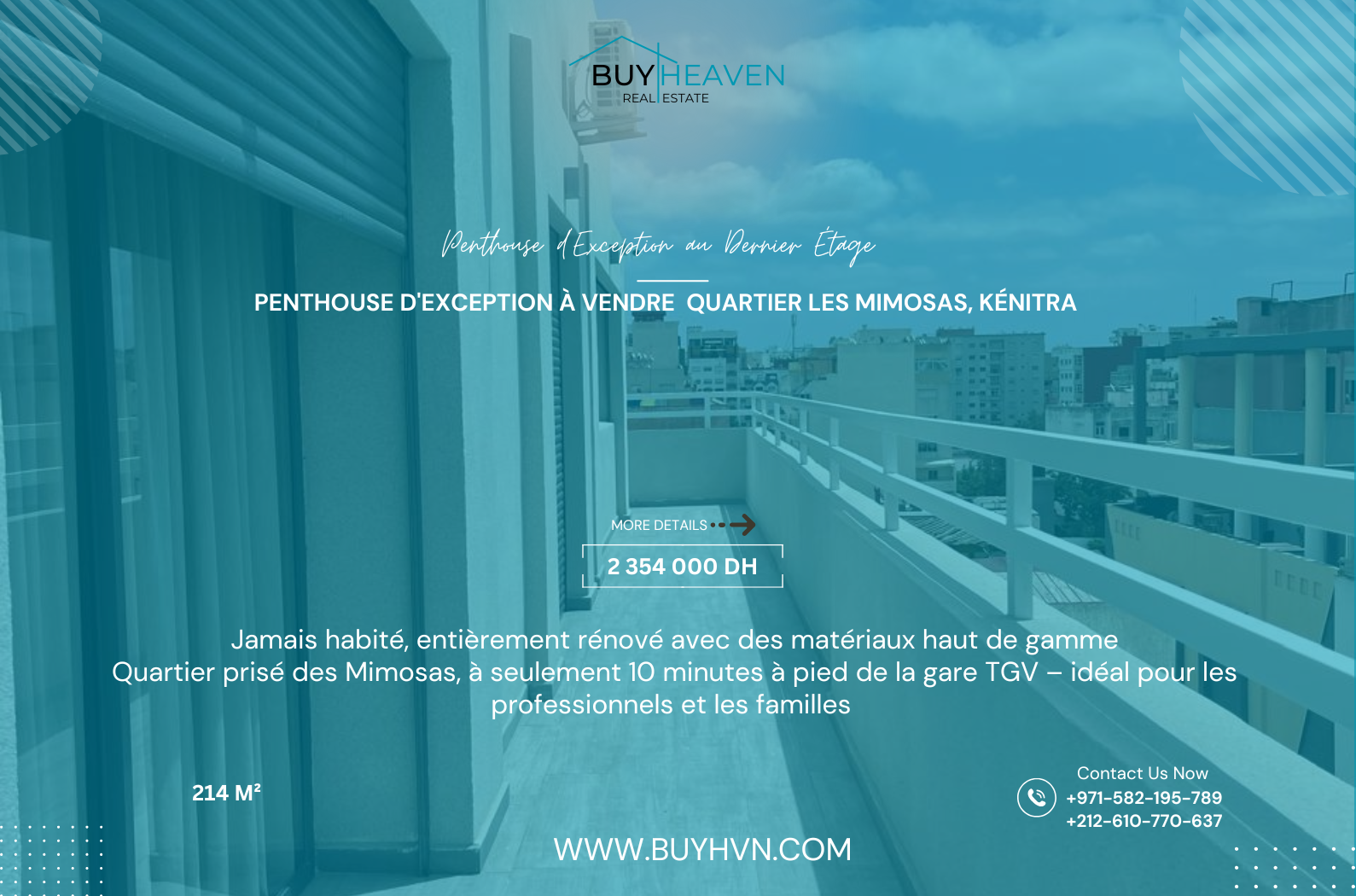 A rare opportunity to own a luxurious, move-in-ready penthouse in one of Kénitra’s most sought-after neighborhoods.
